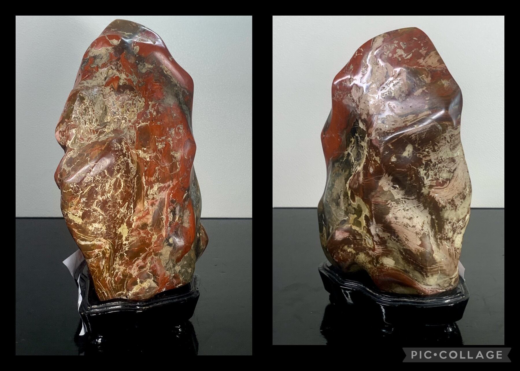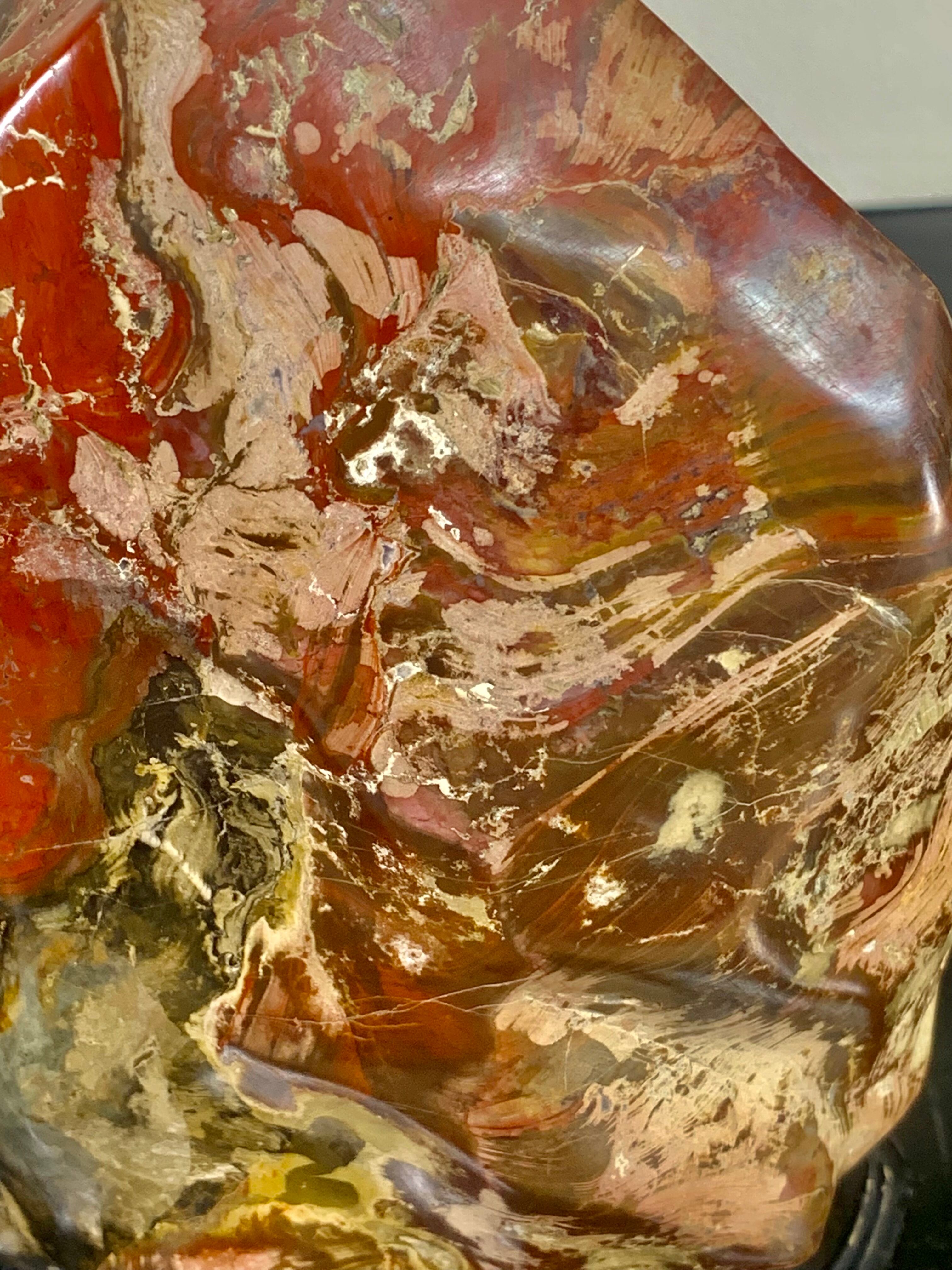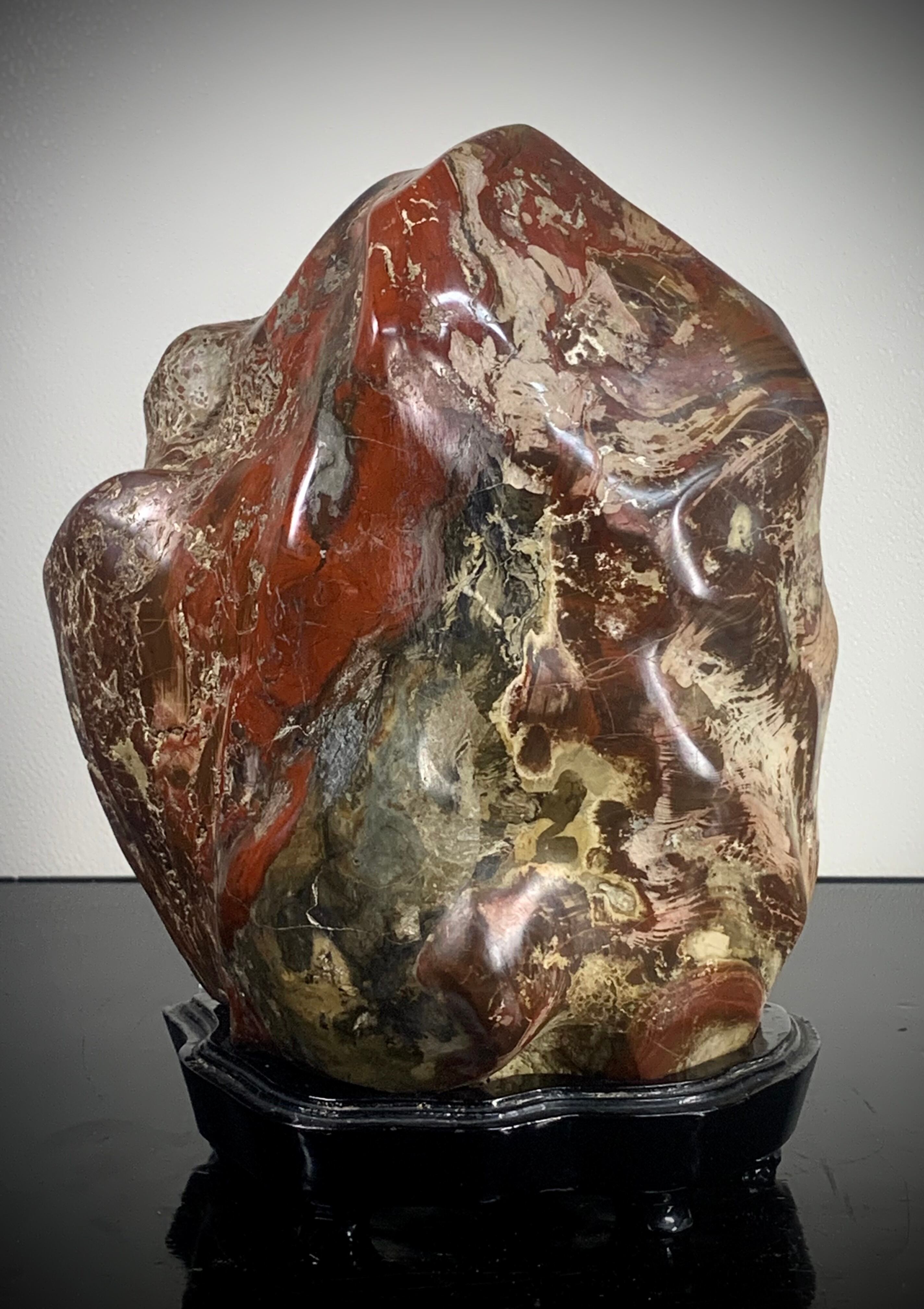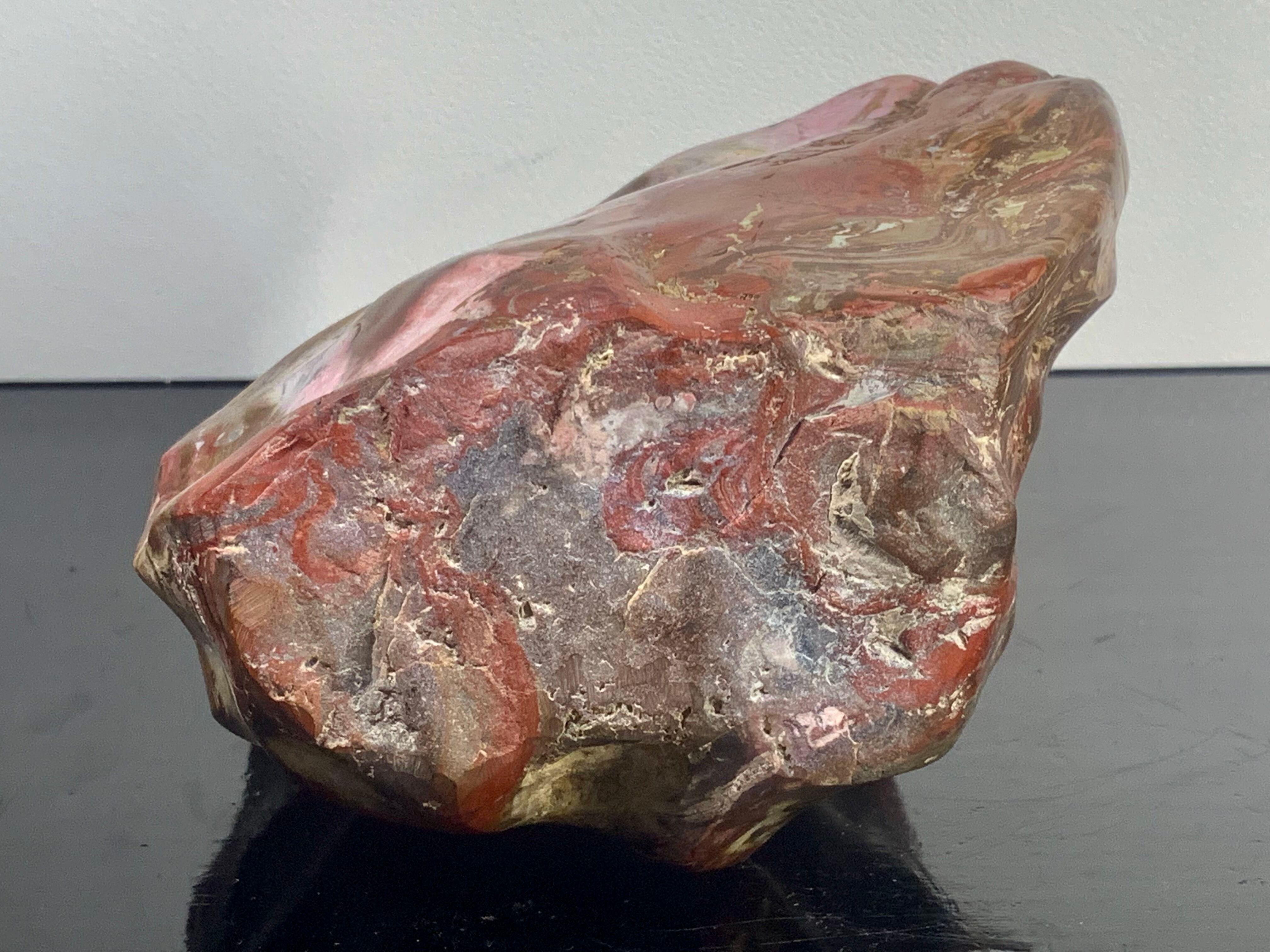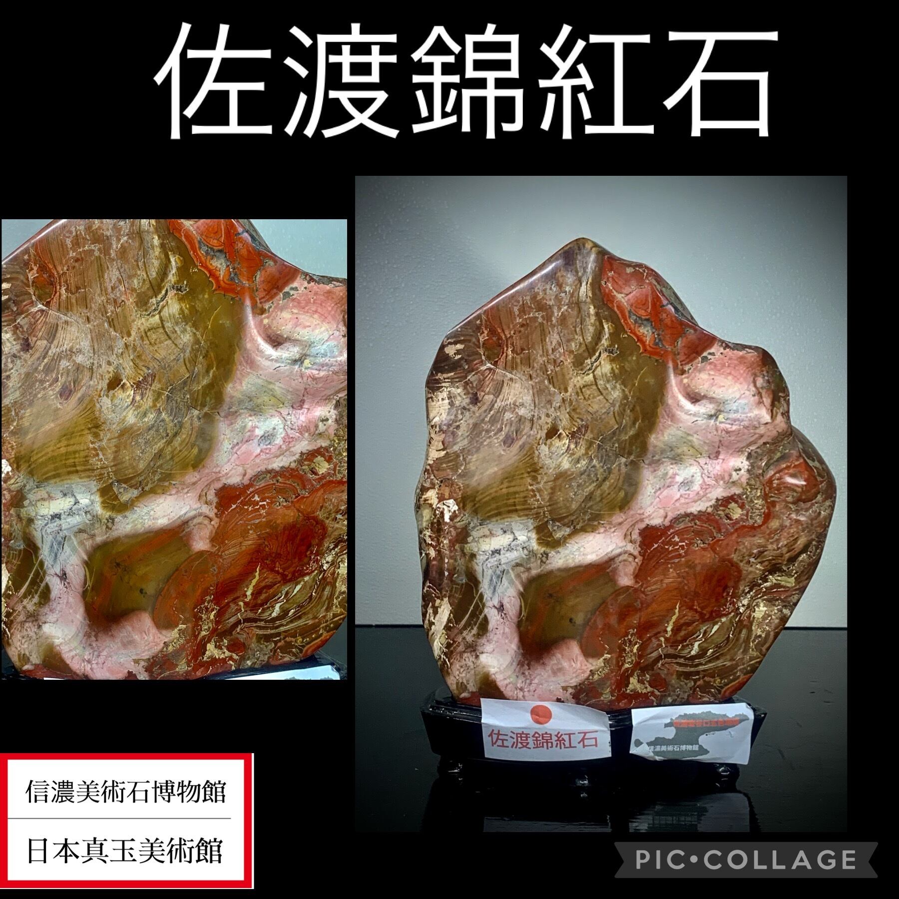 【信濃美術石博物館】 【真品保証】4464 佐渡錦紅石 横16×高21×奥行8(cm) 重量:3.12kg(台座込)佐渡赤玉石 赤石