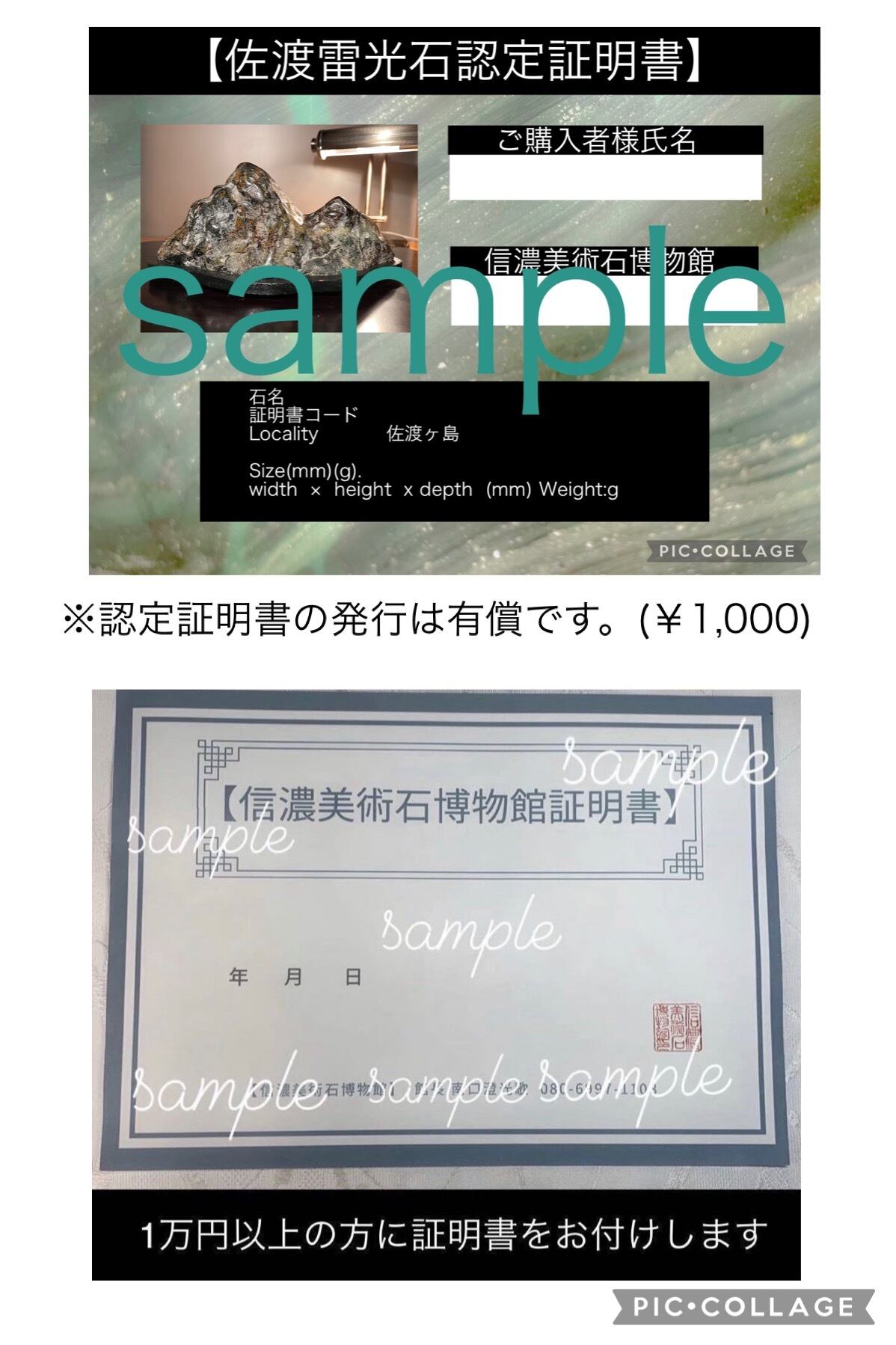 1万円以上のご購入の方に信濃美術石博物館証明書をお付け致します。