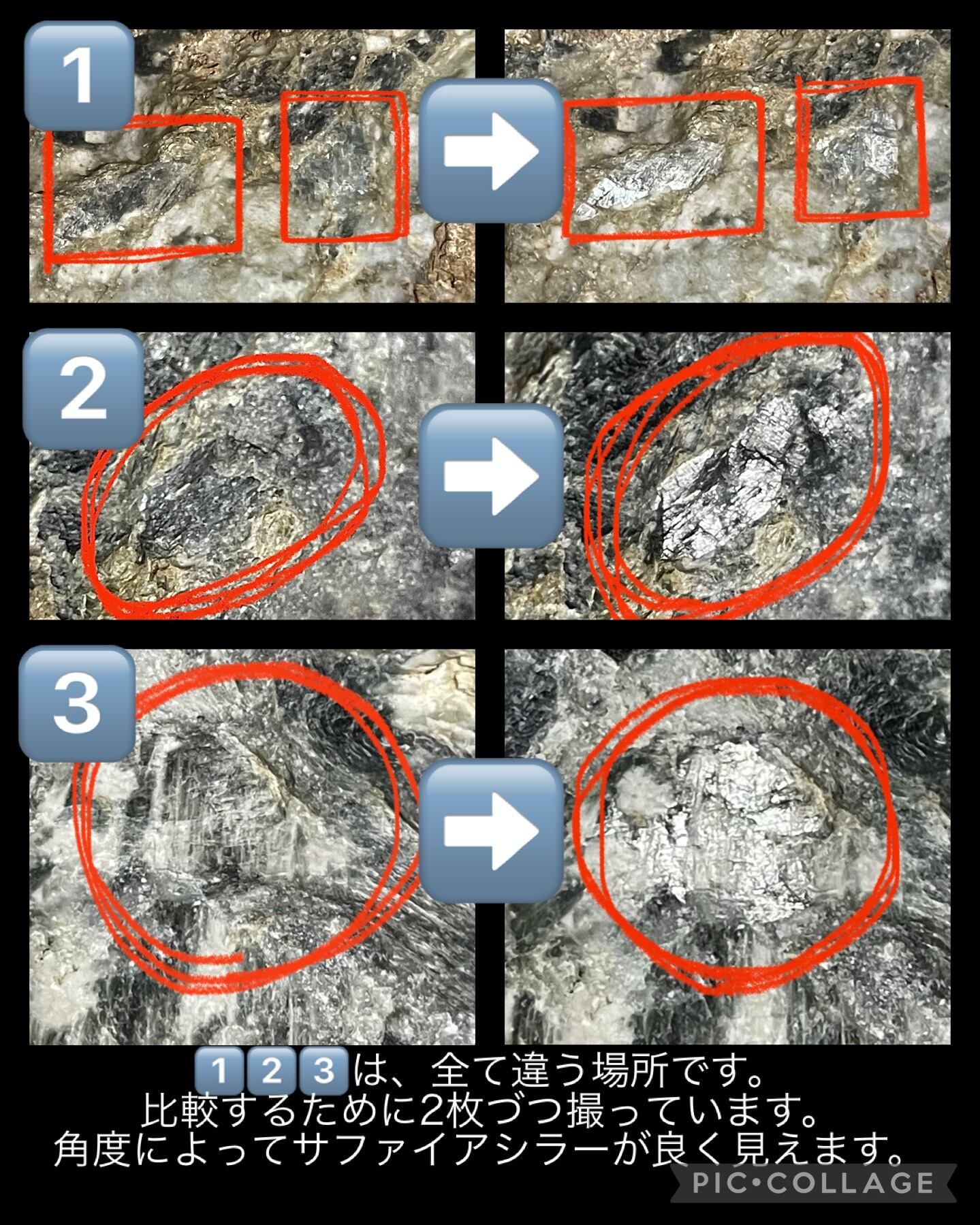 写真3枚目をご参照ください。サファイアのシラーが特にわかりやすいところのみ撮影しました。