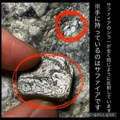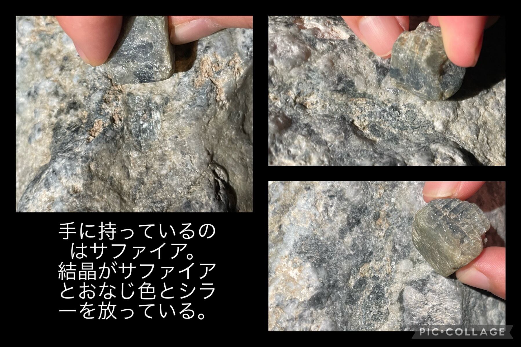 写真4枚目をご参照ください。手に持っているサファイアと該当石の結晶がサファイアと同じ色・同じシラーを放っています。