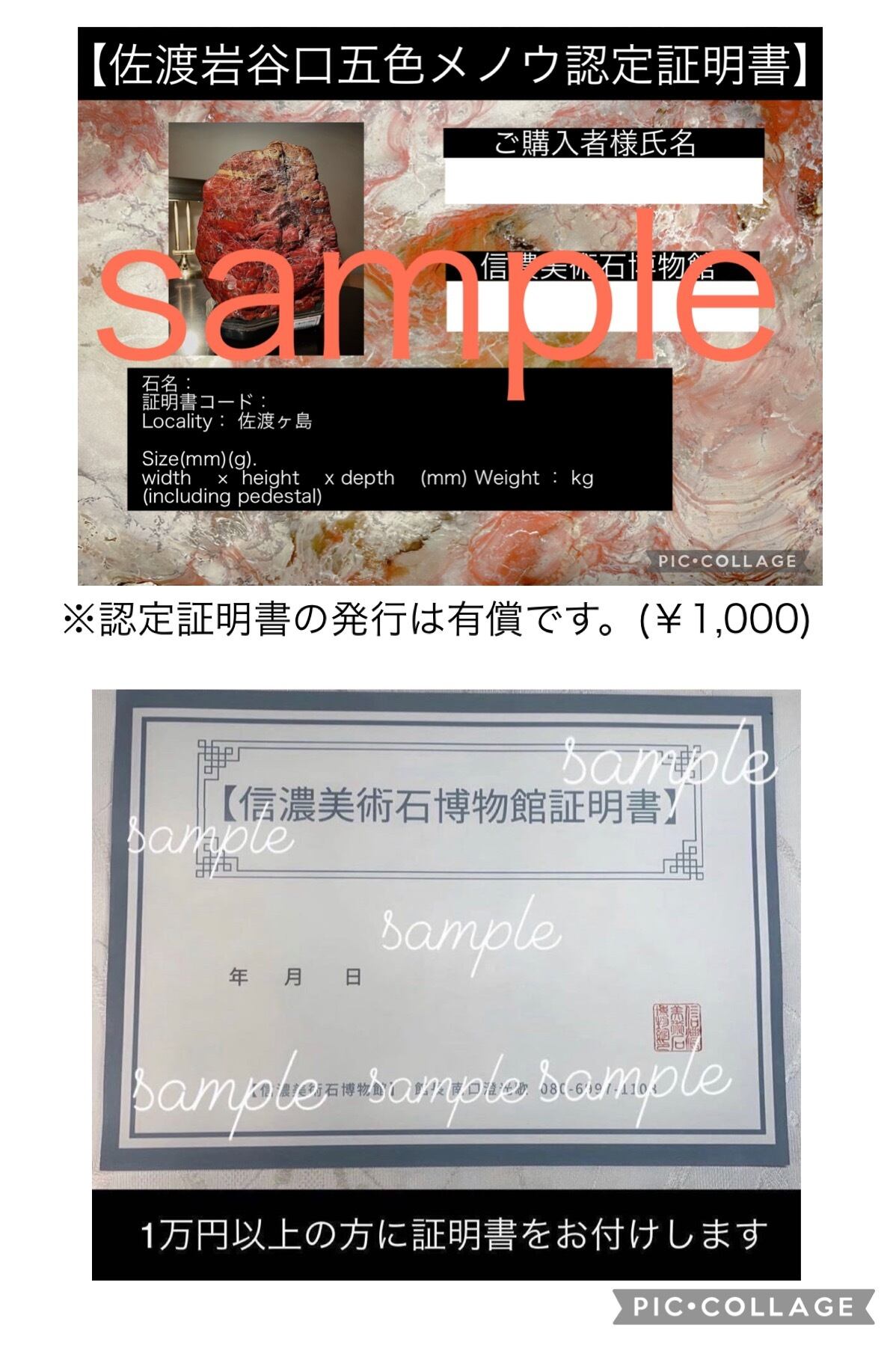 1万円以上のご購入の方に信濃美術石博物館証明書をお付け致します。