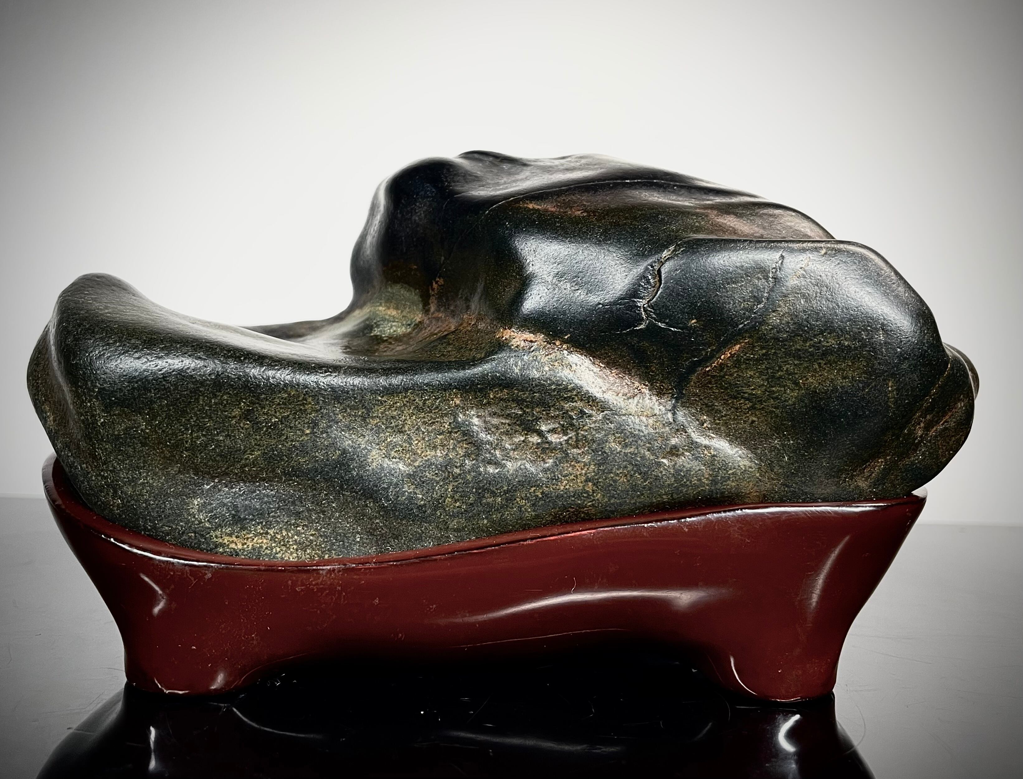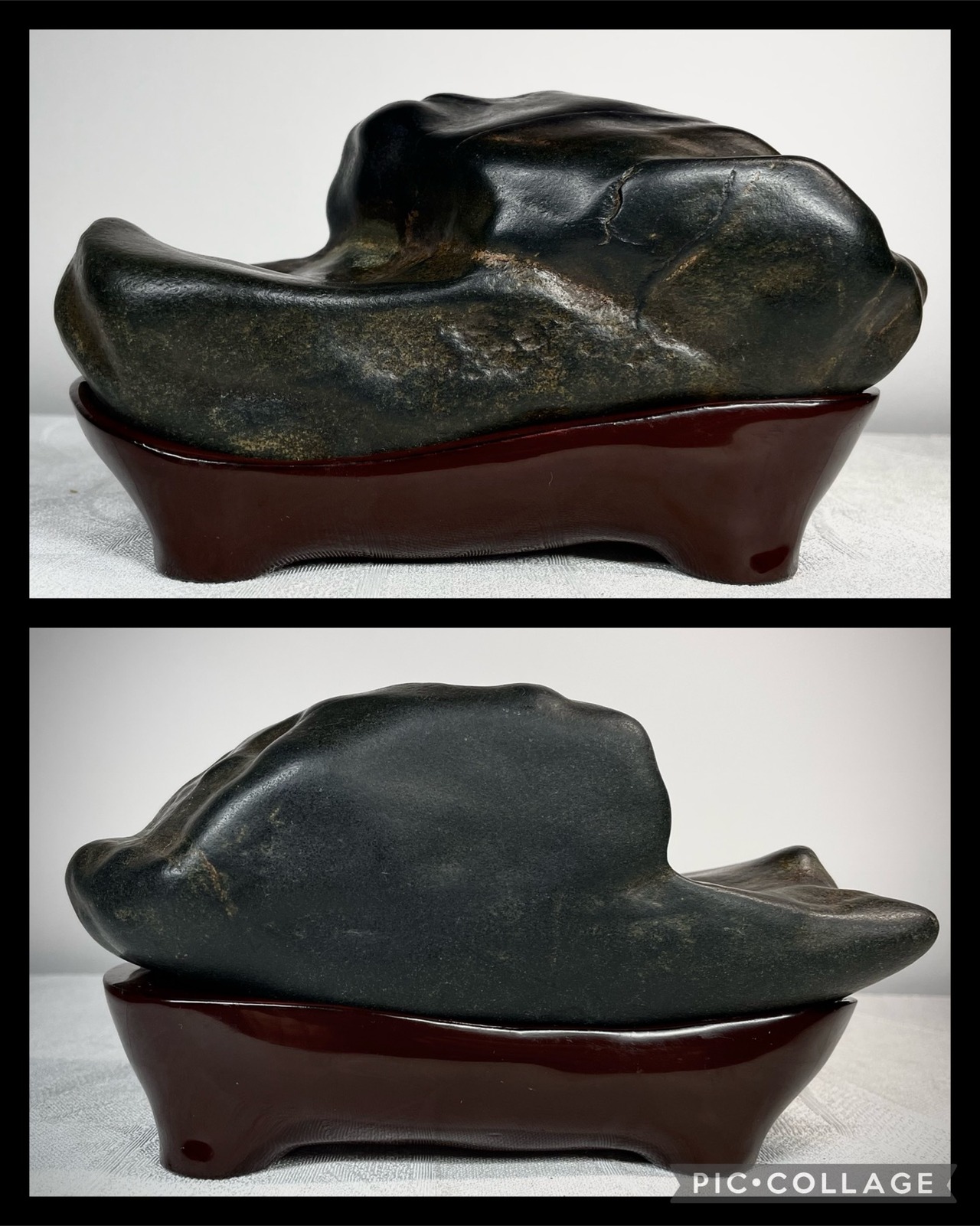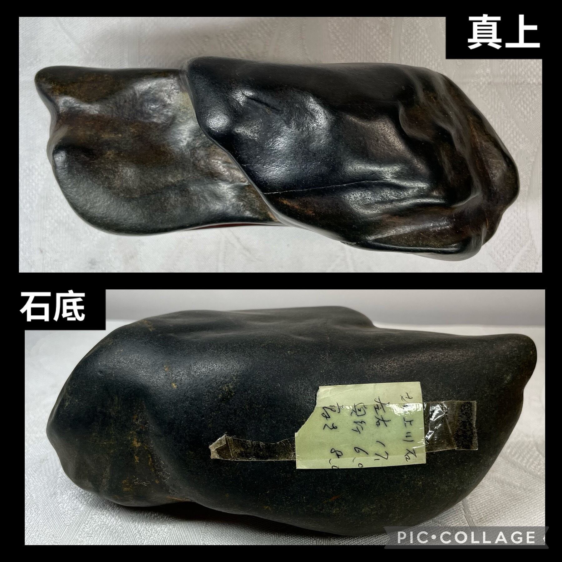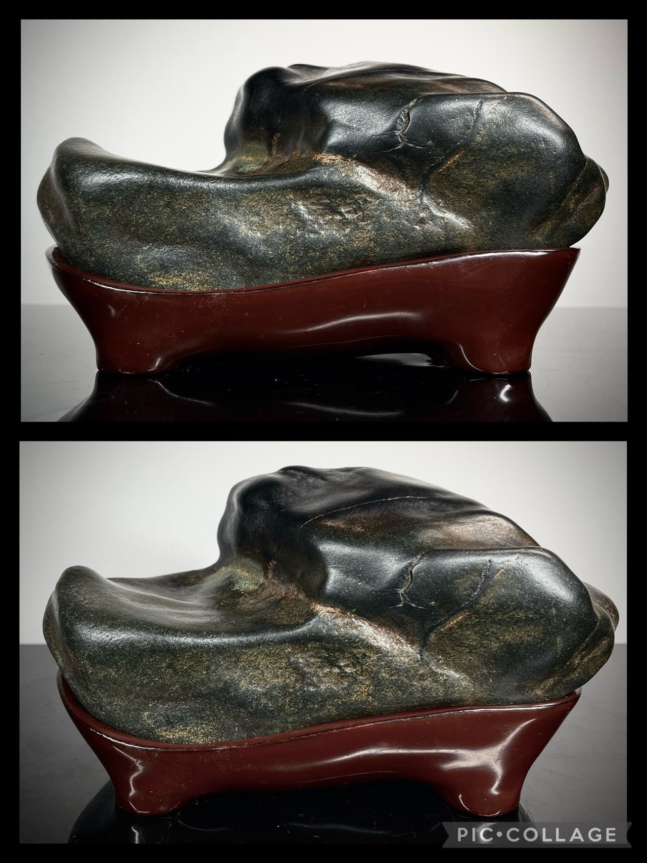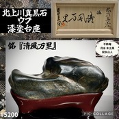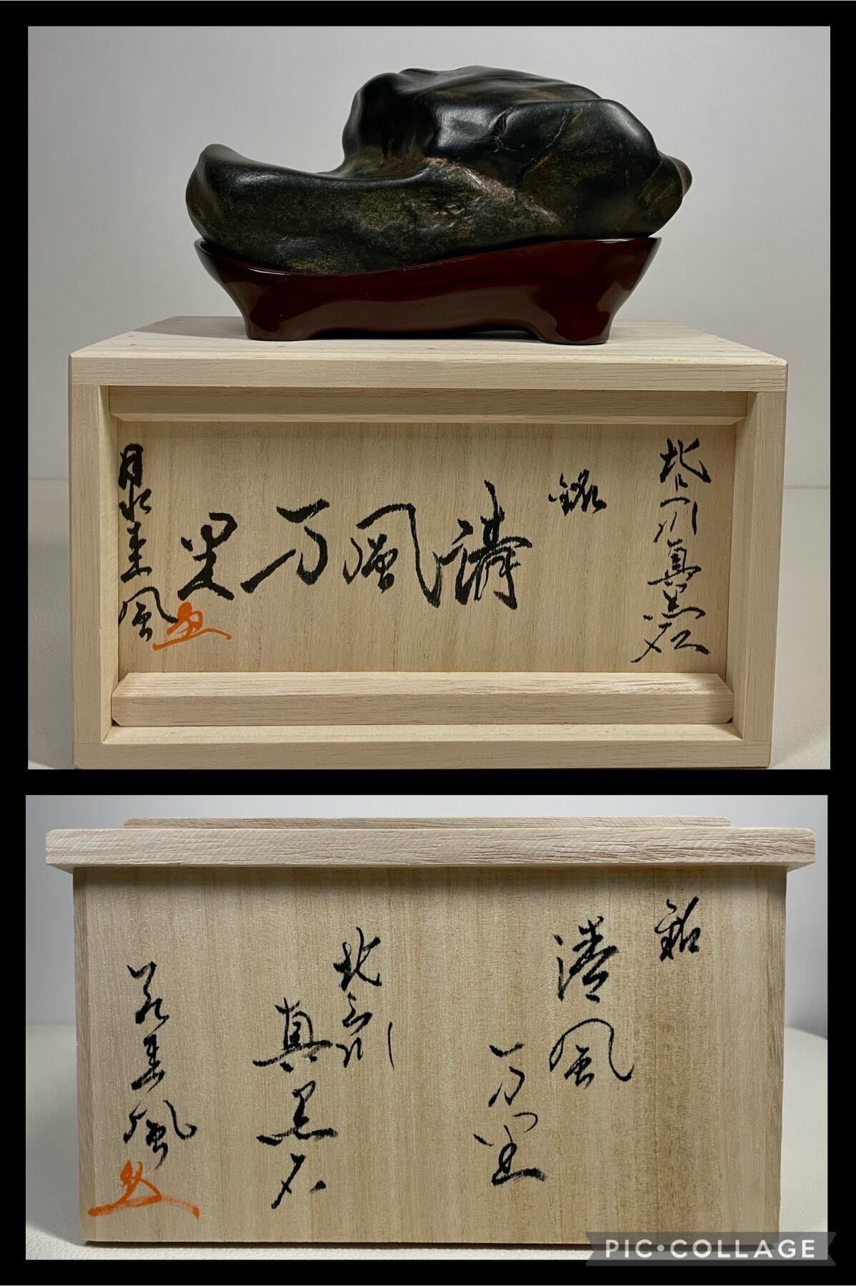 【不粋庵/月水木土風】 水石 盆栽《最高質》北上川真黒石 ウブ 『清風万里』漆塗台座 横17(cm)1.36kg盆石鑑賞石観賞石太湖石中国古玩 5200