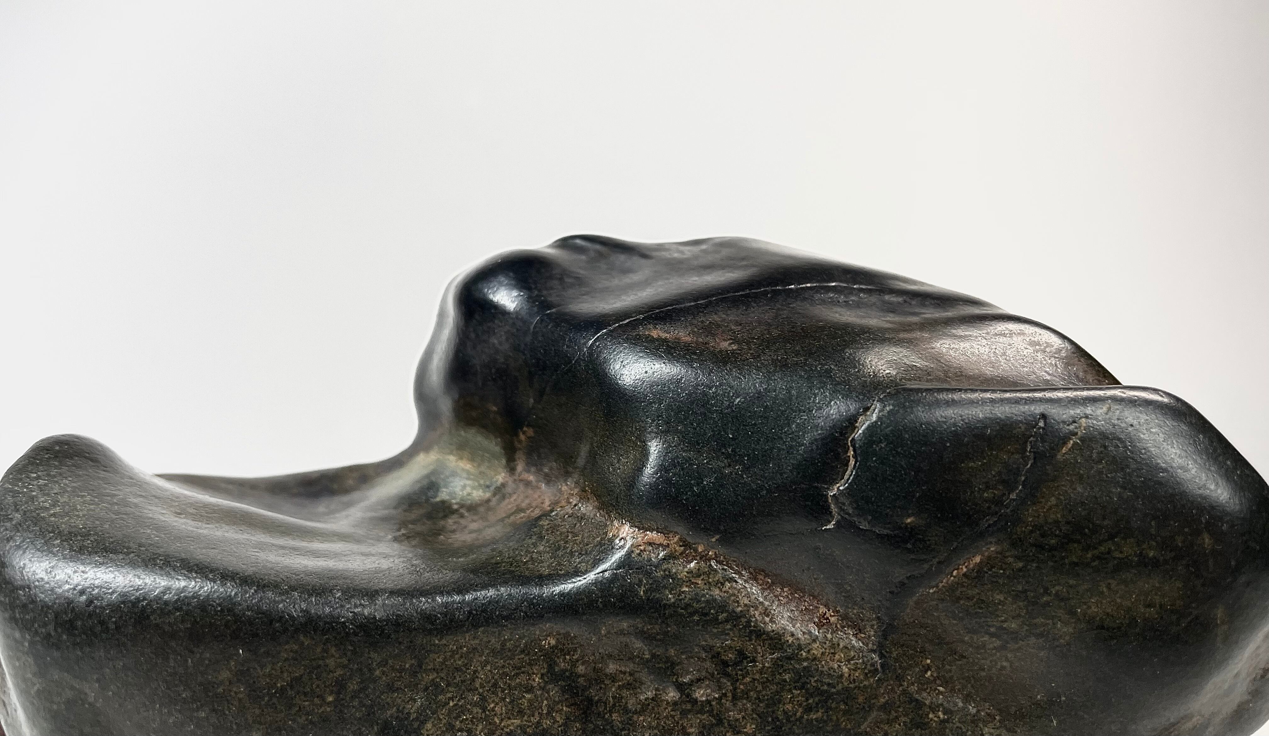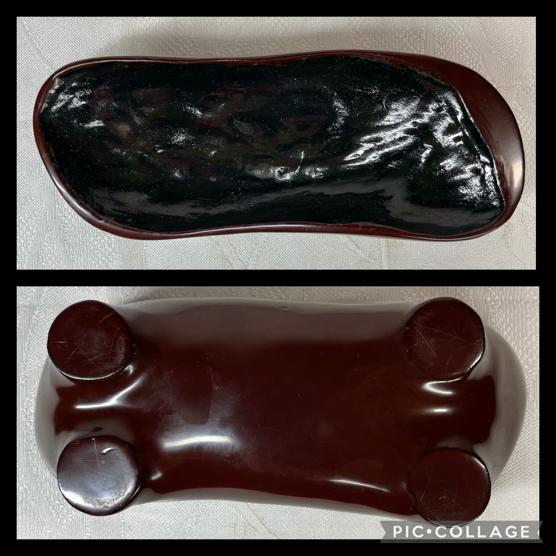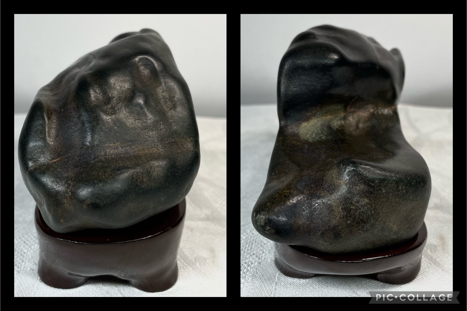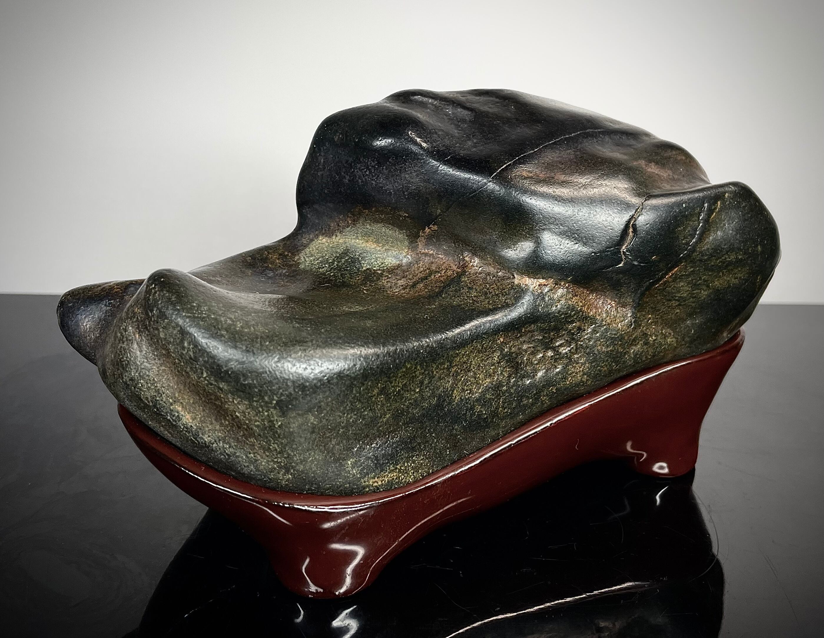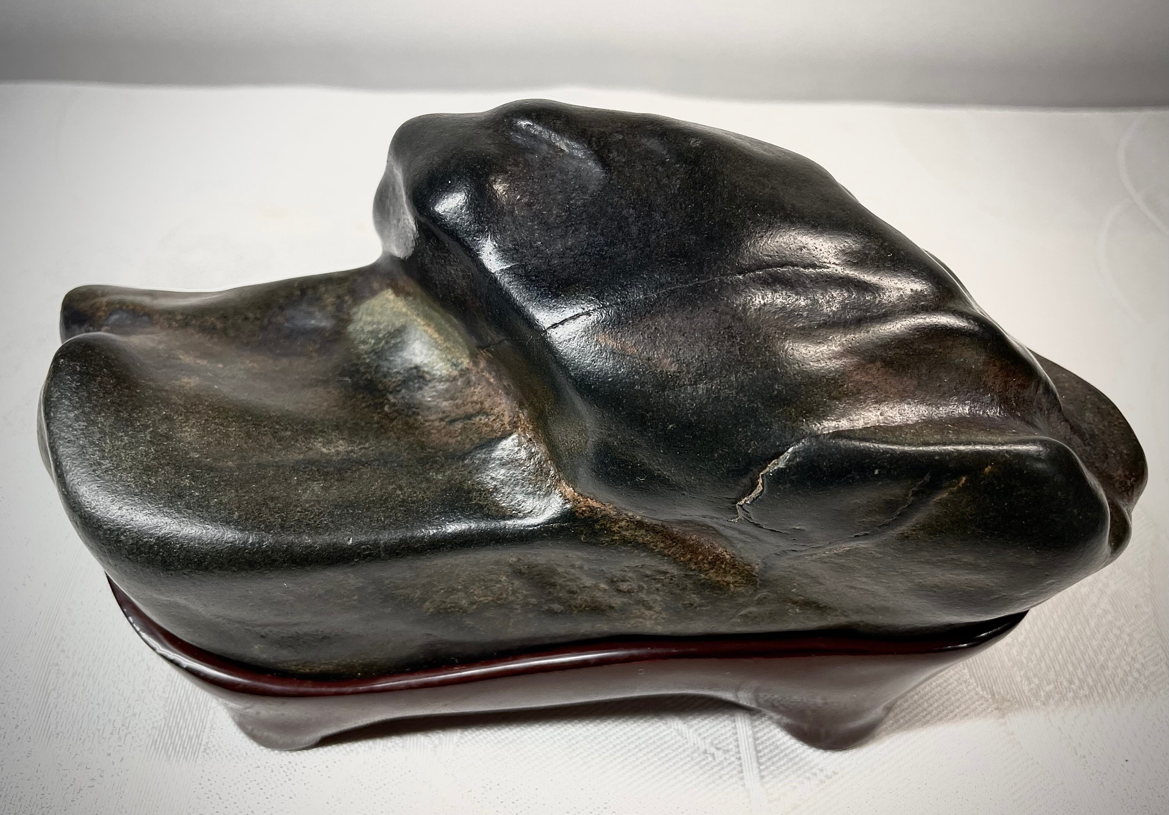 【不粋庵/月水木土風】 水石 盆栽《最高質》北上川真黒石 ウブ 『清風万里』漆塗台座 横17(cm)1.36kg盆石鑑賞石観賞石太湖石中国古玩 5200